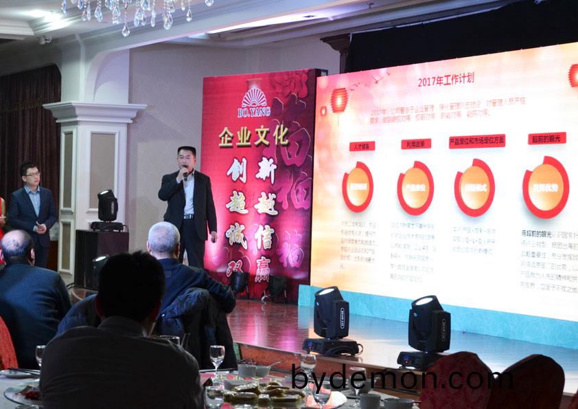 晚会开始,闫吉祥总经理致新年贺词,首先讲述了2016年的目标完成情况,然后回顾2016年公司在各个方面取得的成就,分析了公司在营销队伍、技术队伍、生产方面和后勤方面存在的问题以及改进的办法,并做了2017年的工作规划,将企业管理和管理队伍的建设提到重要位置上来,做到德权对等、权职对等、职能对等、能薪对等。公司副总经理孙红金也做了重要讲话,总结了2016年公司在技术方面取得的各项成绩,“中国水电港航博阳机械专用设备研发中心”、“山东省科学院博阳机械机器人研究中心”、与日本ユーグロップ株式会社的全面合作协议、济南大学泉城学院安丘博阳机械公司实践教学基地的成立以及多项专利和发明的成功申请从整体上提高了公司的研发能力,为2017年的工作发展奠定了良好的基础。随后生产副总岳经理也对生产和售后部门2016年的工作做了全面的总结,对2017年的工作提出了殷切的期望。
