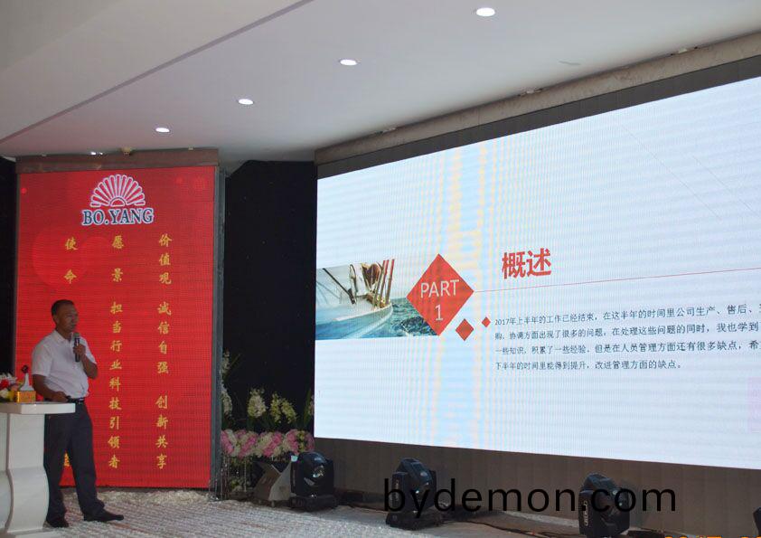 2017年8月20日下午,安丘博阳机械制造有限公司2017年度年中总结会议暨下半年目标达成动员大会在安丘汇泉酒店召开。总经理闫吉祥,副总经理孙红金、岳献宝、李文明及全体员工参加会议,济南蓝海创新私董会会长李英佳受邀参加会议,会议由副总经理李文明主持。