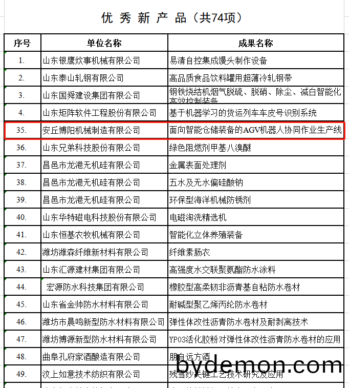 根据《山东省企业技术创新奖审定管理办法》和有关评审细则,由山东省企业技术创新促进会和山东省中小企业发展促进中心联合组织的2019年度技术创新youxiu成果、youxiu新产品、youxiu论文评选活动已结束,安丘博阳机械的面向智能仓储装备的AGV机器人协同作业系统和面向智能仓储装备的AGV机器人协同作业生产线分别荣获2019年度山东省企业技术创新“youxiu成果一等奖”和“youxiu新产品一等奖”!!!