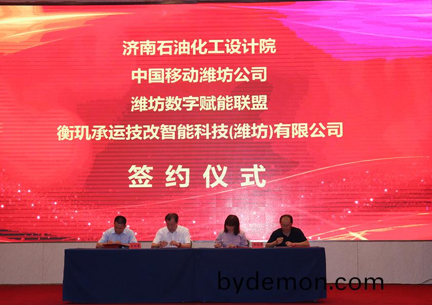 会上,安丘博阳机械制造有限公司总经理闫吉祥与山东省工业和信息化厅规划与技改处处长王楗夫共同为衡玑承运技改智能科技(潍坊)有限公司揭牌。并与济南石油化工设计院、中国移动潍坊分公司、潍坊数字赋能联盟、潍坊海吉润玻璃钢有限公司、瑞福油脂股份有限公司等九家公司签订合作协议。