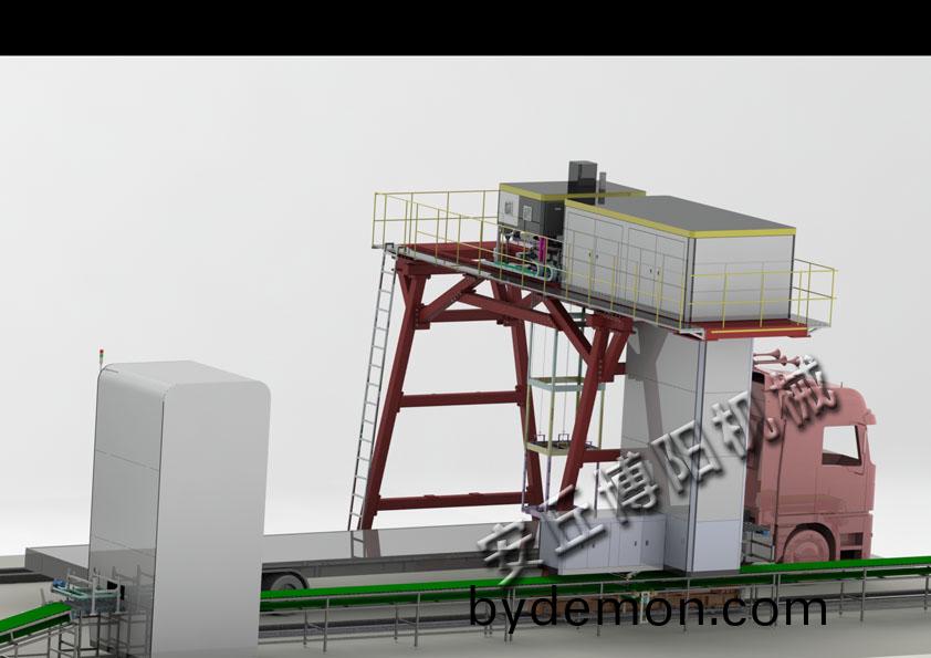 2、全方位垂直装车机:桁架可以前后移动,可以在桁架上左右移动,也可以在行架上进行高低方向移动,并且可以360度旋转,通过全方位的移动实现货物袋在各种车型上的预定放置