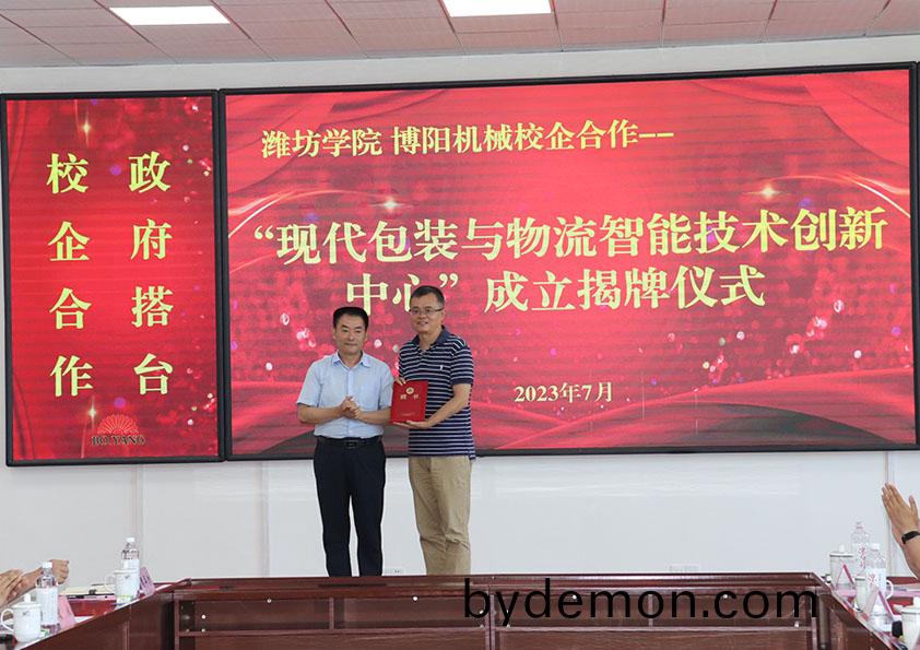 2023年7月5日上午,潍坊学院博阳机械校企合作--现代包装与物流智能技术创新中心成立揭牌仪式在公司举行,潍坊学院党委委员、副校长马茜华