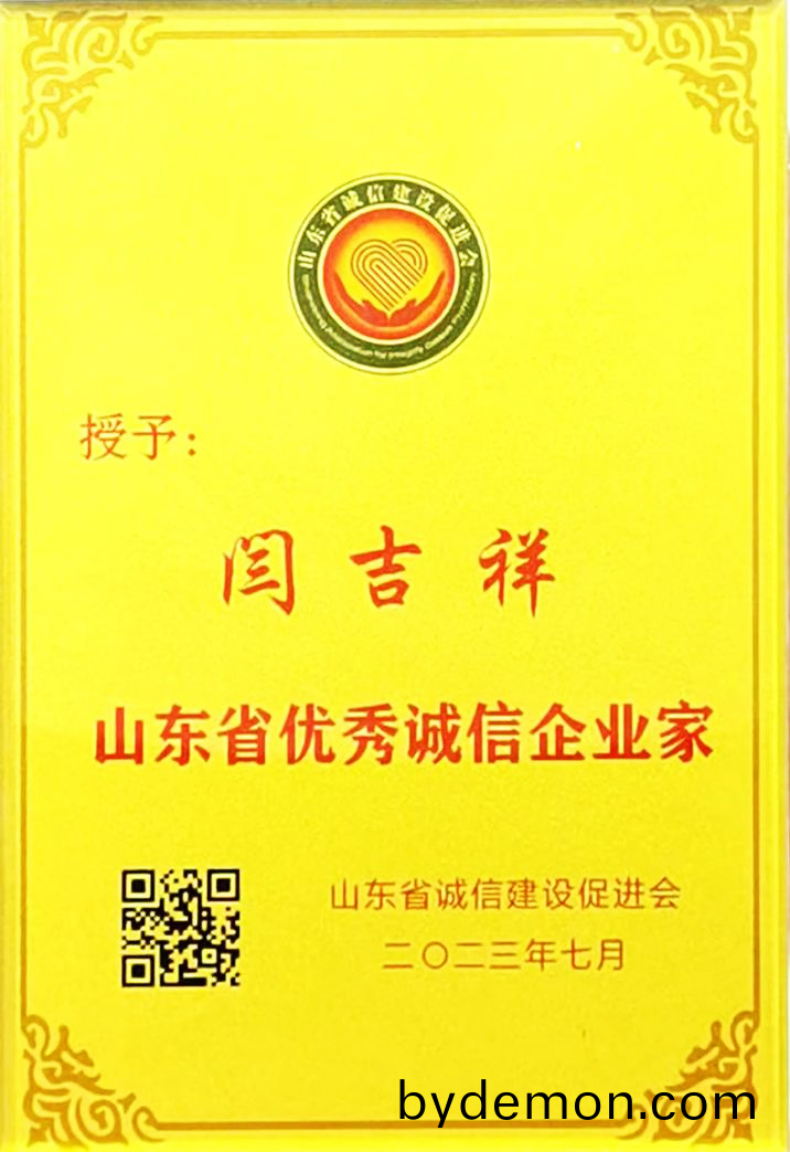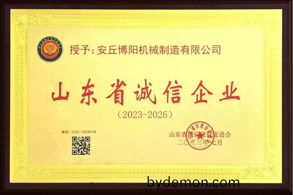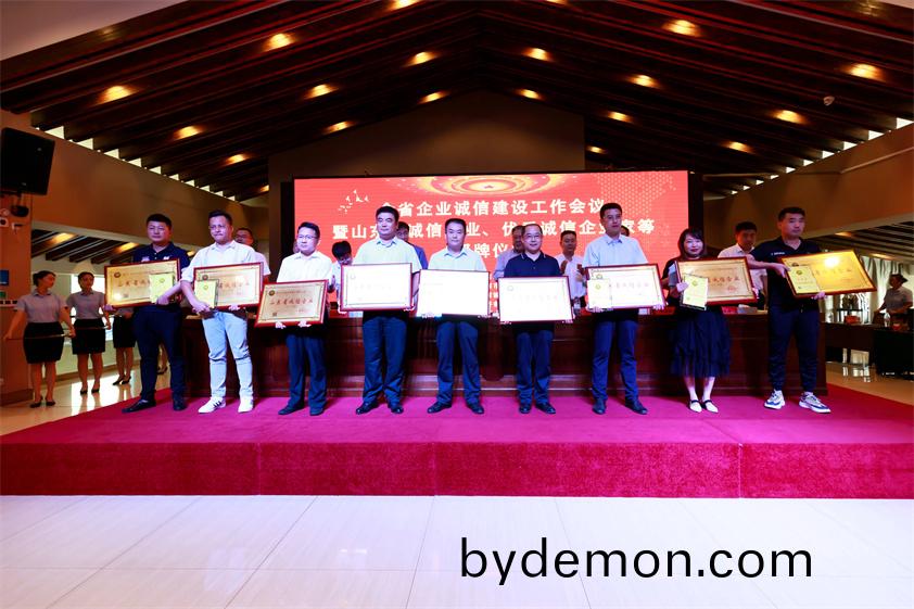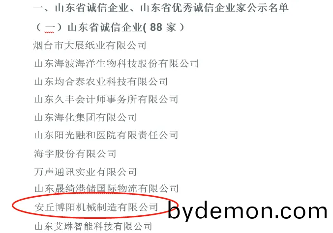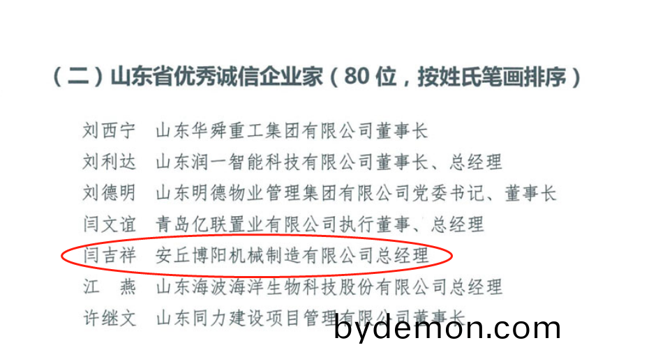 2023年8月10日,全省企业诚信建设工作会议暨山东省诚信企业、优秀诚信企业家等授牌仪式在烟台举行,会议表彰了全省88家诚信企业、80名优秀诚信企业家,并为他们颁发了匾牌和证书。其中安丘博阳机械制造有限公司在评选中喜获佳绩,荣获“山东省诚信企业”称号;博阳机械总经理闫吉祥获评“山东省优秀诚信企业家”。
