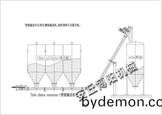 管链输送机是输送粉状、小颗粒状及小块状等散状物料的连续输送设备,可以水平、倾斜和垂直组合输送。在密闭管道内,以链片为传动构件带动物料沿管道运动。当水平输送时,物料颗粒受到链片在运动方向的推力。当料层间的内摩擦力大于物料与管壁的外摩擦力时,物料就随链片向前运动,形成稳定的料流;当垂直输送时,管内物料颗粒受链片向上推力,因为下部给料阻止上部物料下滑,产生了横向侧压力,所以增强了物料的内摩擦力,当物料间的内摩擦力大于物料与管内壁外摩擦力及物料自重时,物料就随链片向上输送,形成连续料流。