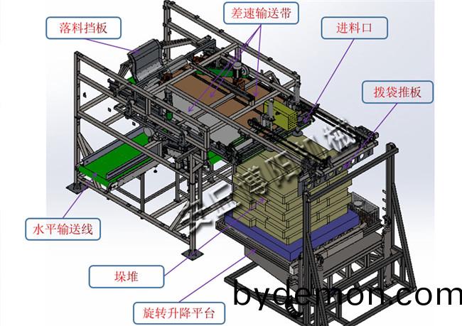 差速自动拆垛机可以实现五花垛或六顺垛的连续差速拆垛,料袋整平,使料袋进入生产线。主要组成部分有:旋转升降平台、活动差速输送平台、落料输送线以及压平整形机构、水平输送线等部分;